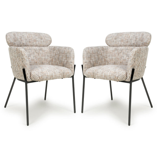 The Rome Fabric Dining Chairs are a contemporary and versatile addition to any dining space, offering both comfort and style. Available in a set of two from CozyFurnitureDirect, these chairs are upholstered in a stunning multi-tonal toffee-coloured textured woven fabric that brings warmth and sophistication to your home. The generously designed bucket seat with high armrests ensures excellent support, while the cylindrical headrest cushion adds an extra touch of comfort. Completed with distinctive slim, angular black metal legs, the Rome chairs combine sleek modern design with inviting practicality, making them ideal for UK homes seeking stylish seating solutions.
