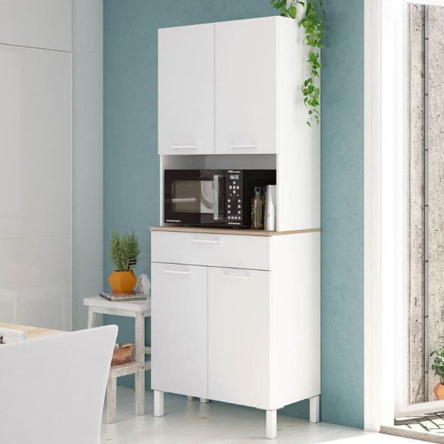 Enhance your kitchen organisation with the Wooden Kitchen Cabinet With 4 Doors And 1 Drawer - Denver, available at CozyFurnitureDirect. The Denver utility cupboard pairs a fresh white finish with warm oak effect worktops for a stylish and inviting look. Featuring four doors, one drawer, and a handy hutch perfect for storing your microwave or other essentials, this cupboard offers generous and versatile storage solutions. Its tall design, measuring 186cm high, 72cm wide, and 40cm deep, makes it ideal for maximising space in British kitchens. Delivered flat packed, it combines practicality with modern style for a neat, clutter-free kitchen.