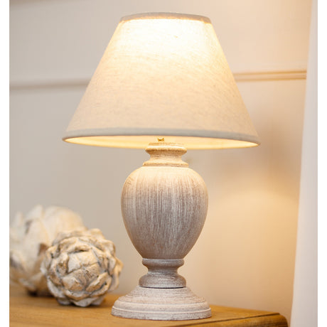 Beige Linen Shade Table Lamp With Neutral Grey Washed Wooden Base - Amorie