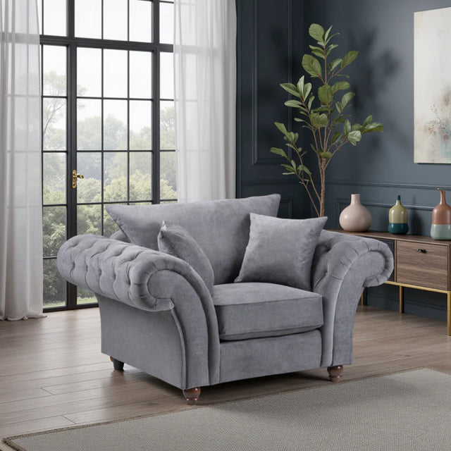 Add classic style and unrivalled comfort to your home with the Windsor Fabric Armchair Fullback from CozyFurnitureDirect. Featuring elegant button-tufted scroll arms and a timeless silhouette, this armchair exudes sophistication while providing deep comfort. The foam-filled seat cushions and solid wood frame ensure durability and lasting support, while removable cushion covers make cleaning effortless. Perfect for traditional and contemporary UK interiors, the Windsor Armchair is designed to combine elegance, comfort, and practicality.