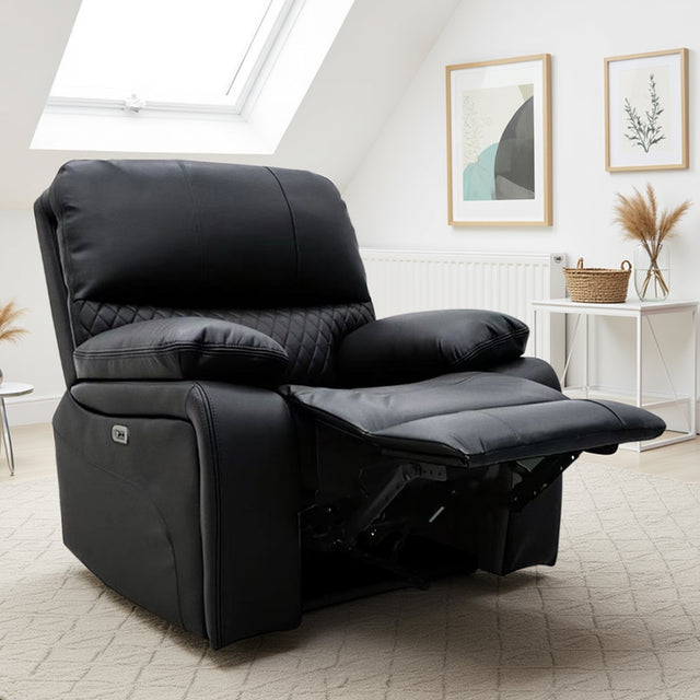 Experience modern comfort and advanced functionality with the Orla Faux Leather Armchair Recliner from CozyFurnitureDirect. This luxurious recliner combines premium faux leather upholstery with smart design details to bring sophistication and relaxation to your home. Featuring a quilted back design and a smooth, space-saving reclining mechanism powered by a reliable German Okin motor, the Orla Recliner offers effortless comfort. With built-in USB and USB-C ports, it adds convenience to contemporary UK lifestyles.