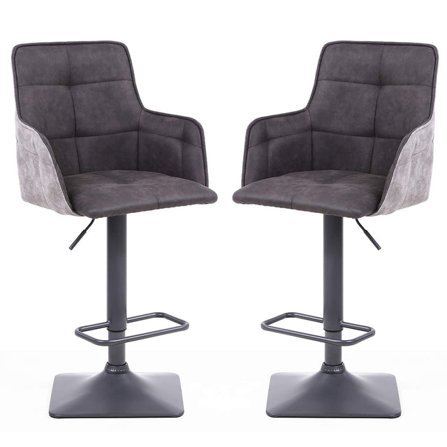 The Orion Suede Effect Fabric Bar Stools bring a bold and contemporary statement to your kitchen or home bar, offering both comfort and modern style. Available in a set of two at CozyFurnitureDirect, these stools feature a distinctive twin-tone design with a dark grey padded suede-effect seat complemented by a light grey rear for striking contrast. Fitted with a sturdy iron grey square base and a signature bar-style footrest, the stools provide durability and support. With a swivel function and adjustable height up to 120cm, the Orion Bar Stools combine versatility with stylish comfort, perfect for UK interiors seeking a sleek upgrade.