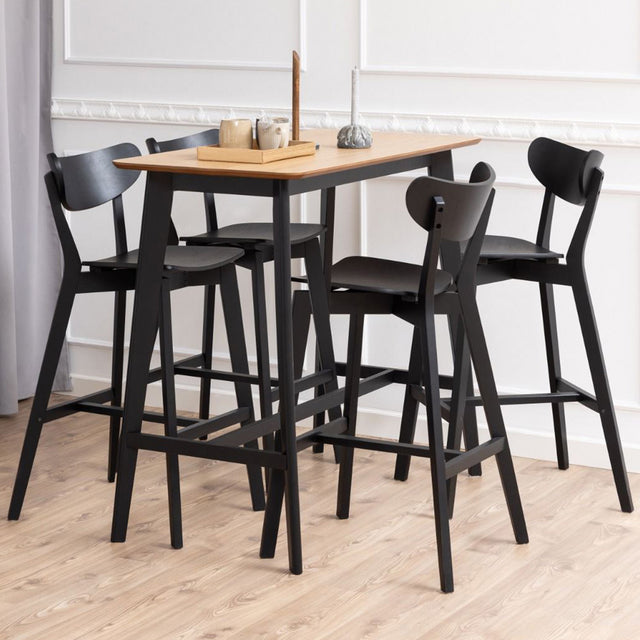 Bring a bold and modern edge to your dining or entertaining space with the Roxby Wooden Bar Table Set with 4 Bar Stools, available at CozyFurnitureDirect. Designed with a sleek lacquered oak veneer top and matte black legs, the bar table serves as a stylish centrepiece for both casual meals and social gatherings. The set comes complete with four matching all-black bar stools, each crafted with supportive backrests and built-in footrests for maximum comfort. Perfect for everything from intimate wine nights to lively game evenings, this versatile set blends practicality with striking contemporary design, making it a standout choice for UK homes.