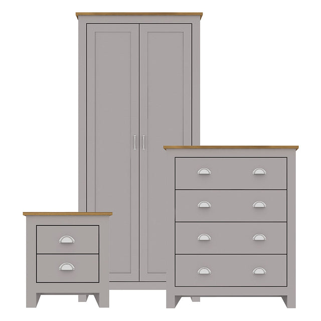 - Complete three-piece bedroom set includes a wardrobe, bedside cabinet and chest of drawers