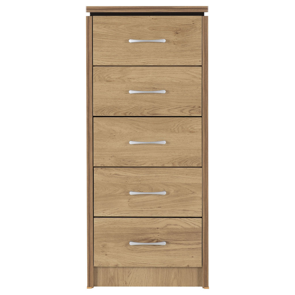 Maximise your bedroom storage with the Charles Wooden Chest Of 5 Drawers Narrow from CozyFurnitureDirect. This elegantly designed chest is crafted from durable composite board with a refined paper and plastic veneer finish, fitting effortlessly into modern UK interiors. Its narrow design is perfect for smaller spaces, while the five smooth-gliding drawers provide ample storage for clothes, accessories and essentials. Equipped with robust metal runners, sturdy MDF drawer bases and plastic feet for stable support, this chest also includes an anti-tip strap for added safety. The Charles chest combines functionality, style and practical safety features, making it a trusted choice for British homes.