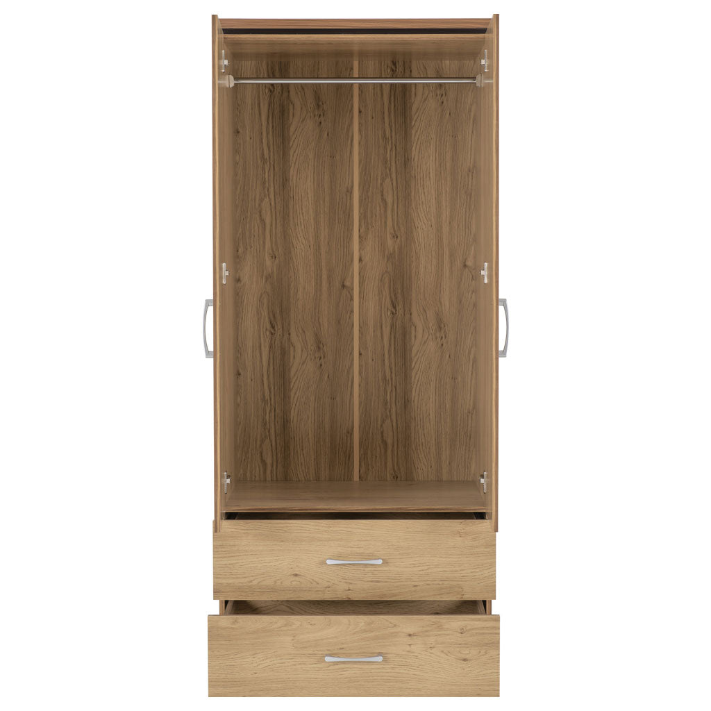 Transform your bedroom with the Charles Wooden Wardrobe With 2 Doors And 2 Drawers from CozyFurnitureDirect. Crafted from High - quality composite board and finished with modern paper and plastic veneer, this wardrobe offers reliable durability and timeless appeal for UK homes. With a spacious hanging area, two roomy drawers, smooth metal runners and a sturdy metal hanging rail, the Charles wardrobe keeps clothes organised and accessible. Elegant plastic handles and an anti-tip strap provide safety and everyday convenience, making it ideal for family use or guest rooms. Choose the Charles wardrobe for a chic, practical solution tailored to UK lifestyles.