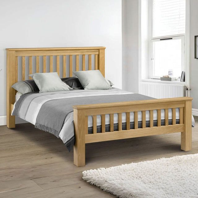 Create a striking bedroom centrepiece with the Amsterdam Wooden Double Bed with High Foot End, available at CozyFurnitureDirect. Crafted from solid white oak and premium oak veneers, this imposing shaker-style bed combines traditional craftsmanship with timeless elegance. Its bold frame and warm oak finish bring character and presence to any bedroom, complementing both classic and contemporary UK interiors. Beyond its commanding design, the Amsterdam Bed offers practical comfort with a fully sprung slatted base, providing enhanced support for your mattress and ensuring long-lasting durability. Built to last, this robust wooden bed is not only stylish but also a reliable choice for restful, comfortable nights.