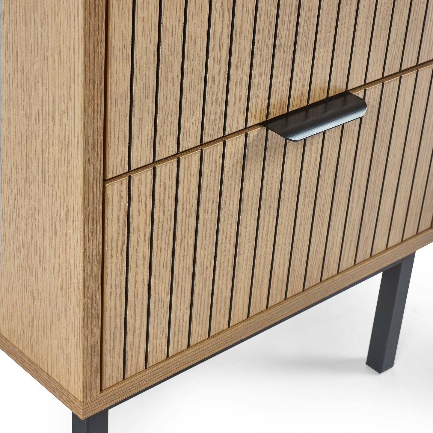 Upgrade your bedroom with the chic Sia Wooden Bedside Cabinet with 2 Drawers from CozyFurnitureDirect. Showcasing a modern vertical slat effect on the drawer fronts, this bedside table adds a refined touch to any bedroom space. The compact yet spacious design offers two roomy drawers - perfect for keeping night-time essentials, books and gadgets neatly stored and easily accessible. Finished with sleek black handles and sturdy black metal legs, the Sia Bedside blends style, durability and practicality. Quick and easy to assemble, it - s the perfect addition for contemporary UK bedrooms looking to combine elegance with everyday convenience.