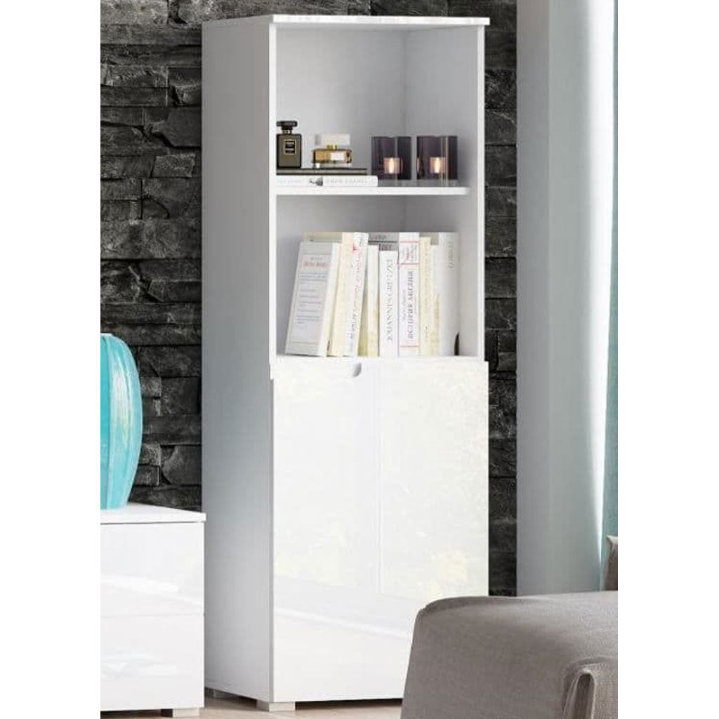 Enhance your home organisation with the High Gloss Bookcase With 1 Door - Salina, available at CozyFurnitureDirect. The Salina short narrow bookcase features a sleek white gloss finish complemented by matt white sides and top for a contemporary, elegant look. With four tiers including one handle-less door, it offers versatile storage and display options for books, decorative items or storage bins. Measuring 50cm wide, 35cm deep and 145cm high, this flat-packed bookcase is perfect for maximising space while adding modern style to any room in British homes.