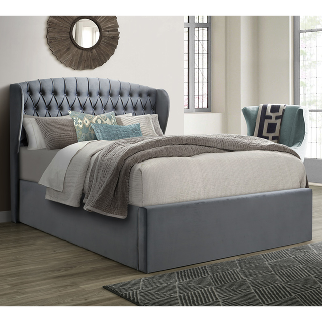 Capture timeless sophistication with the Velvet Ottoman Storage Double Bed - Warwick from Cozy Furniture Direct, a grey velvet haven blending winged grandeur and deep storage for UK bedrooms. Solidly built with foam-filled upholstery, its beautiful winged and buttoned headboard (10.8cm deep, 24cm wing depth) commands attention, while the fully boarded base-accessed via powerful gas lift-offers 30cm interior storage height to protect belongings from the floor. The 41cm footboard height and 9cm footboard depth maintain a low, inviting profile, complemented by 9cm slat gaps for breathable comfort. In chic grey velvet, Warwick delivers enduring style and practicality without excess bulk. Perfect your retreat at Cozy Furniture Direct.