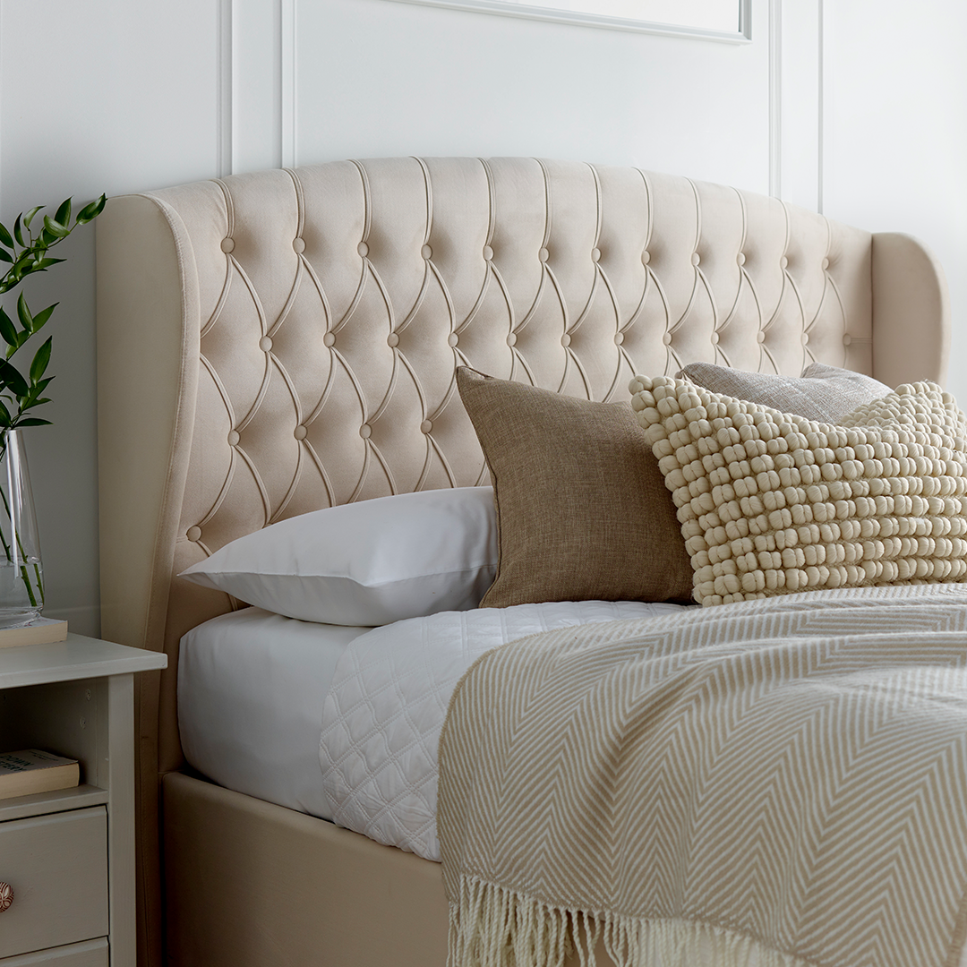 - Dramatic winged and buttoned headboard, 10.8cm deep with 24cm wing depth