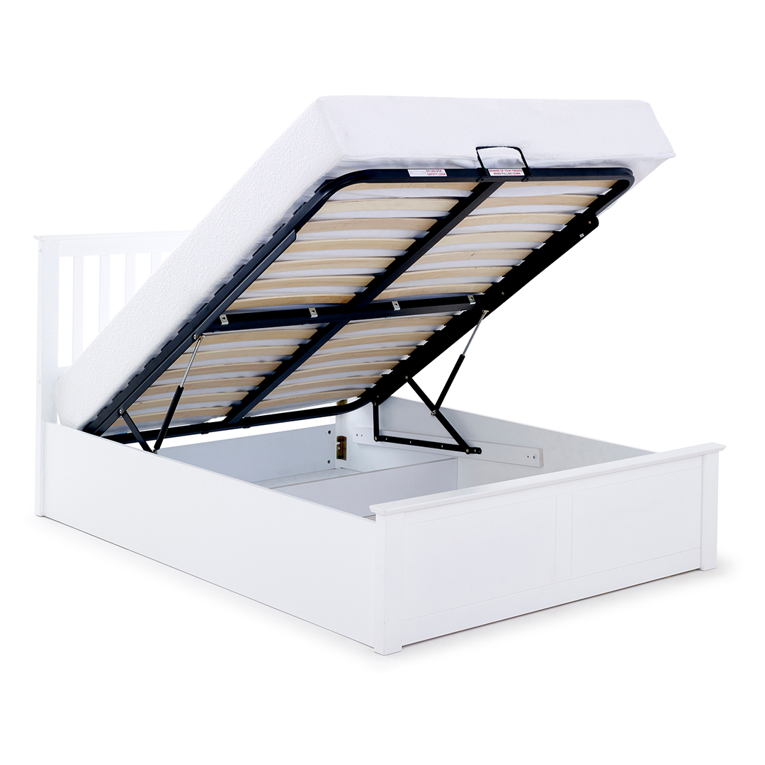 Discover versatile elegance with the Wooden Ottoman Storage Double Bed - Malmo from Cozy Furniture Direct, a stylish powerhouse blending tradition and innovation for UK bedrooms of all styles. Its white-finished solid Rubber wood frame, accented by a slatted headboard and low profile, adapts effortlessly to classic or modern decors while delivering unmatched durability. Harness the gas-assisted hydraulic pistons for smooth foot-end lift, unveiling a 27cm deep storage space segmented into three sections atop an internal boarded base-keeping contents organised and elevated. The sprung slatted base imparts a natural bounce for superior comfort, and flat-pack delivery with simple instructions makes setup a breeze. Footboard at 42cm and side rail top at 36cm from floor ensure a grounded yet airy presence. Practical perfection awaits at Cozy Furniture Direct.