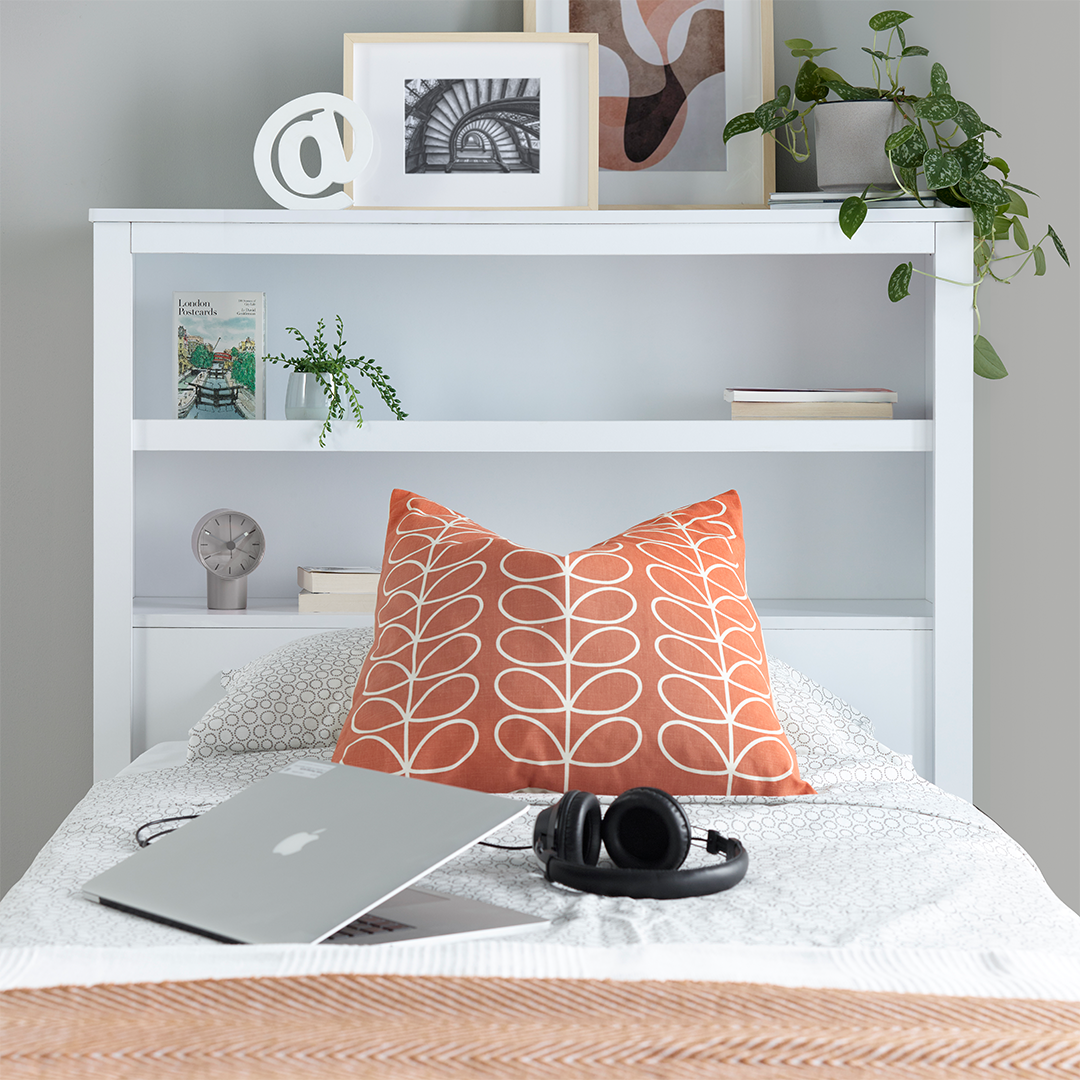 - Innovative bookcase headboard keeping essentials within arm's reach