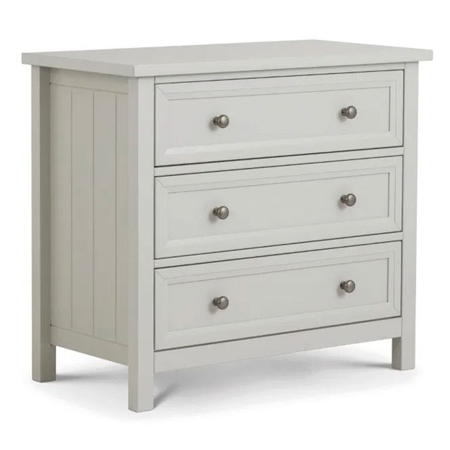Embrace timeless style and practical functionality with the Maine Wooden Chest of 3 Drawers, available at CozyFurnitureDirect. Crafted in a refined New England design, this elegant chest features characteristic side panelling, detailed chamfered edges and an exquisite lacquered finish for a soothing, sophisticated look. The three spacious drawers provide generous storage for clothes, accessories and everyday essentials, helping you maintain an organised and clutter-free bedroom. Finished with delicate pewter handles, the Maine Chest beautifully complements both traditional and modern interiors, making it an ideal addition to any UK home.