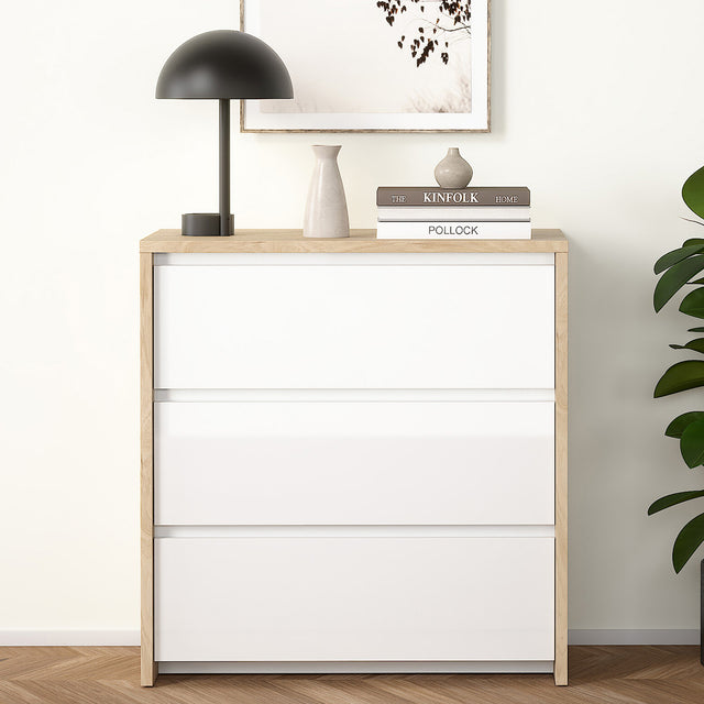 Bring elegance and contemporary style into your home with the Wooden Chest of 3 Drawers - Next, available at CozyFurnitureDirect. Crafted in a warm Jackson Hickory oak frame with sleek glossy white drawer fronts, this sophisticated chest blends natural wood charm with modern finesse. The textured oak tones add depth and warmth, while the smooth high-gloss finish enhances brightness for a refined look. With three spacious drawers, it offers practical storage for clothing, accessories, or household essentials while maintaining a stylish focal point. Versatile enough for the bedroom, living - room, or hallway, the Next chest combines functionality and design excellence, making it a perfect addition to UK homes.