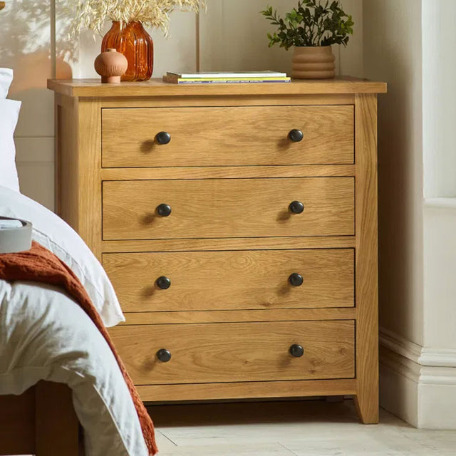 Bring timeless craftsmanship and elegant storage to your bedroom with the Marlborough Wooden Chest of 4 Drawers, available at CozyFurnitureDirect. Expertly crafted from solid white oak and oak veneers, this chest combines durability with a warm, natural aesthetic. Its chunky 30mm top and clean-lined design offer a classic look that complements both traditional and modern interiors. The four spacious drawers, each constructed with sturdy dovetail joints, provide ample storage for clothing and essentials. Finished with a rich waxed sheen that enhances the natural grain of the oak, the Marlborough Chest delivers both practicality and beauty to your home.