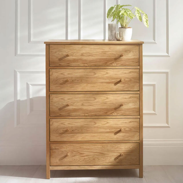 Upgrade your storage with the Coxmoor Wooden Chest of 5 Drawers, available at CozyFurnitureDirect. Beautifully crafted from solid oak with a rich oiled finish, this wide chest brings timeless charm and durability to your bedroom. Designed with five generously sized drawers, each fitted with stylish knob handles, it offers ample space for clothing, bedding, or everyday essentials. Its horizontal profile makes it both practical and visually striking, serving as a stylish focal point in any room. Built with strength and elegance, the Coxmoor chest provides a perfect blend of functionality and classic style for UK homes.