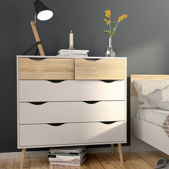 Elevate your storage with the Wooden Chest of 5 Drawers - Oslo, available at CozyFurnitureDirect. Combining Scandinavian simplicity with modern practicality, this chest of drawers is finished in a fresh white and oak colourway for a timeless look. Featuring five smooth-glide drawers, it provides ample space for clothing, accessories, or household essentials, keeping your bedroom neat and organised. Crafted in Denmark from PEFC-certified sustainable wood, with a scratch-resistant finish and anti-tip safety, the Oslo chest ensures durability and peace of mind - making it the perfect storage solution for stylish UK homes.