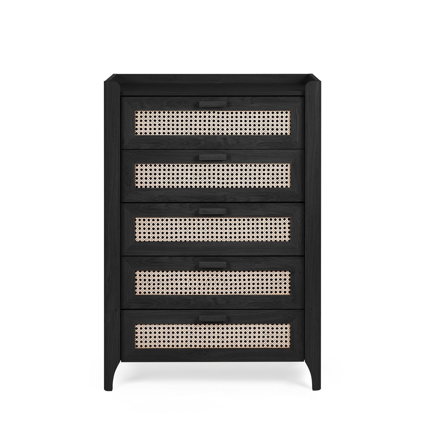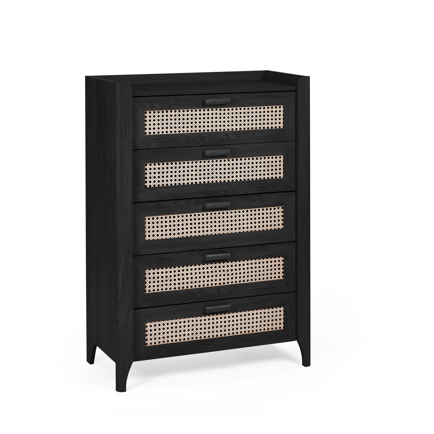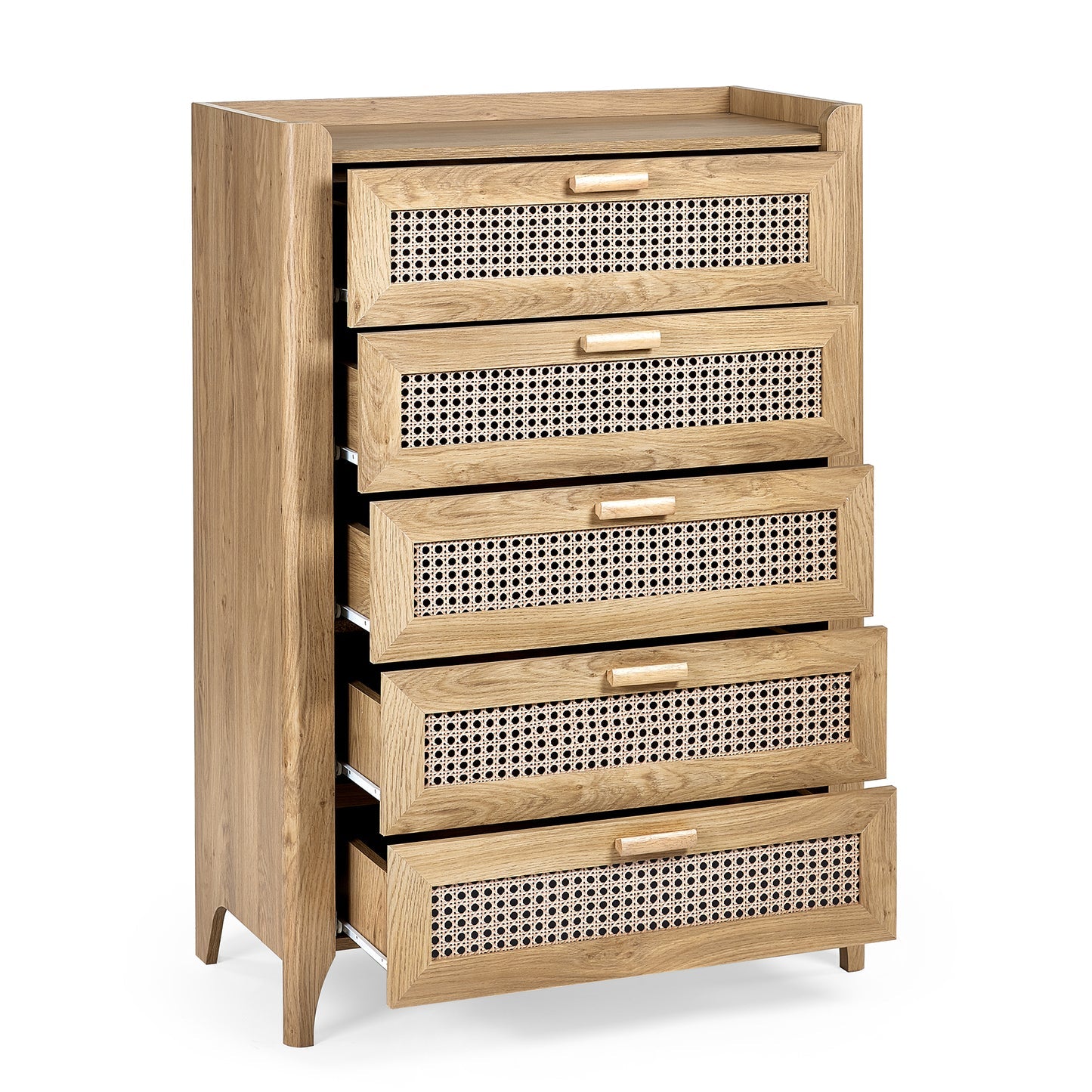 Elevate your bedroom storage with the Sydney Wooden Chest of 5 Drawers from CozyFurnitureDirect, a beautifully designed piece that blends bohemian charm with modern practicality. Featuring gracefully curved edges and a subtle raised lip, this chest offers both style and safety. The natural oak effect finish is complemented by striking rattan-effect drawer fronts, creating a warm, inviting aesthetic perfect for contemporary UK homes. With five spacious drawers and smooth gloved handles for easy access, the Sydney Chest provides ample storage for clothing, accessories and essentials while adding a touch of organic elegance to your bedroom.
