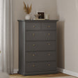 Maximise your storage with the Wooden Chest Of 6 Drawers Tall - Paris, available at CozyFurnitureDirect. Combining the timeless elegance of the Paris Collection with modern practicality, this tall chest offers six spacious drawers for clothing, linens, or everyday essentials. Its romantic European-inspired design radiates sophistication, while the durable laminated board construction delivers exceptional resilience. Resistant to scratches, moisture, and high temperatures, this stylish piece is built to last in busy UK homes. With an easy-to-clean, fade-resistant finish and crafted from PEFC-certified sustainable wood, the Paris 6-drawer chest offers both long-lasting quality and eco-friendly peace of mind.
