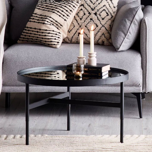 Add a touch of contemporary glamour to your home with the Franki Clear Glass Round Coffee Table with Metal Frame, available at CozyFurnitureDirect. Designed to reflect both style and practicality, this coffee table features a sleek mirrored glass table top that brightens and opens up your living space. The bold black metal frame provides striking contrast, while the raised barrier detail adds both visual interest and functionality, helping to keep items secure. Perfect as a centrepiece in modern lounges, the Franki table combines timeless elegance with a sophisticated edge, making it an ideal choice for stylish UK homes.