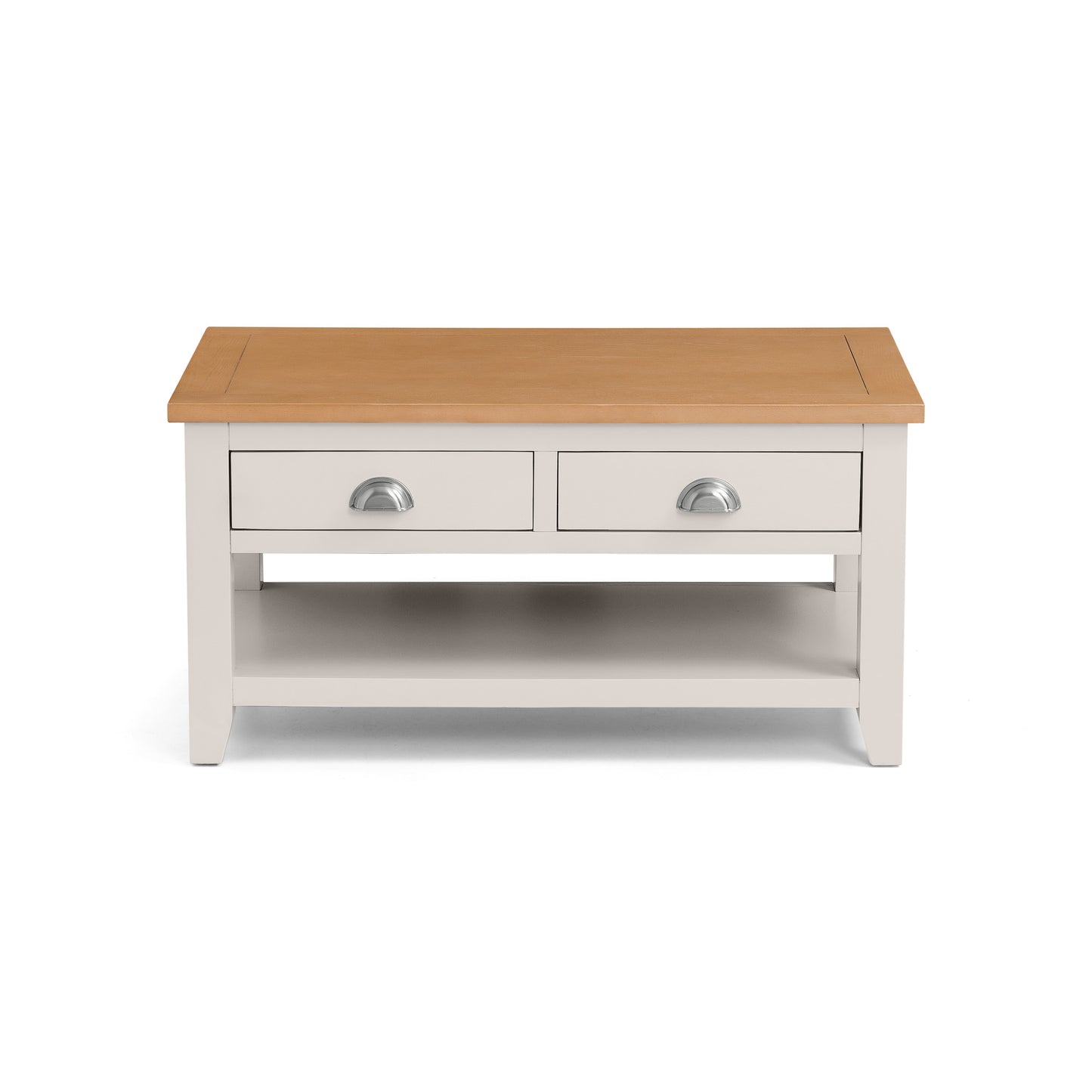 Enhance your living space with the Richmond Wooden Coffee Table with 2 Drawers from CozyFurnitureDirect - a perfect blend of timeless design and modern functionality. Crafted from high-grade white oak solids and veneers, this elegant table features a soft Elephant Grey painted base paired beautifully with a pale oak top. The Richmond offers generous storage with two spacious drawers, each adorned with brushed steel cupped handles, along with a lower shelf ideal for books, magazines or decor. Exuding enduring quality and sophisticated charm, this coffee table seamlessly complements both traditional and contemporary interiors, making it a stylish focal point for any UK home.