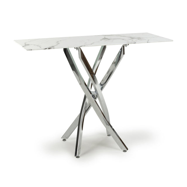 Introduce modern elegance to your home with the Astoria Glass Console Table from CozyFurnitureDirect. Featuring a sleek rectangular design, this statement piece is topped with a white and grey marble effect tempered glass surface that is both heat and stain resistant, offering style and practicality in equal measure. The silver chrome frame with four wrapped-around legs creates a striking base, while adjustable feet provide stability on any floor type. Perfect for hallways, living - rooms, or entryways, the Astoria console table combines timeless glamour with everyday functionality, making it an ideal choice for contemporary UK homes.