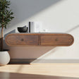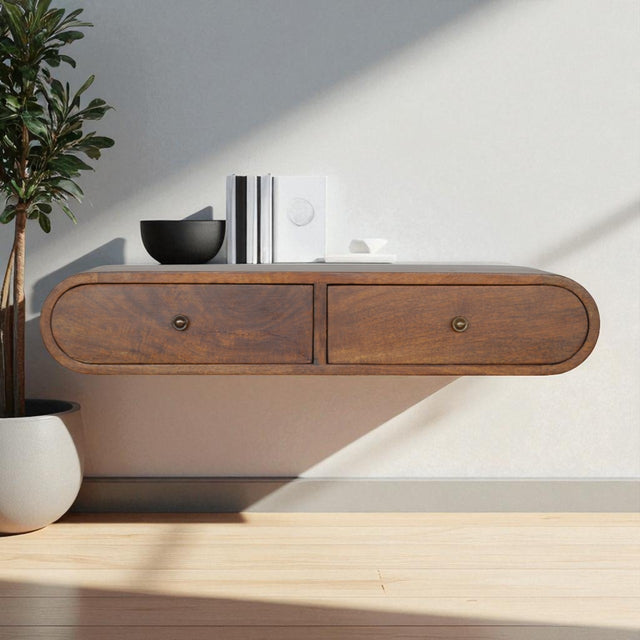 Maximise your space with the elegant London Solid Mango Wood Floating Console Table with 2 Drawers, available at CozyFurnitureDirect. This beautifully curved wall-mounted console table is expertly crafted from 100% solid mango wood with a rich chestnut finish that enhances the natural grain. Designed without legs, it saves valuable floor space while providing functional storage with two spacious drawers and a generous surface ideal for displaying ornaments, plants, or books. Perfect for hallways, living - rooms, or bedrooms, this versatile piece pairs effortlessly with the rest of the curved chestnut collection to bring a cohesive, stylish touch to UK homes.