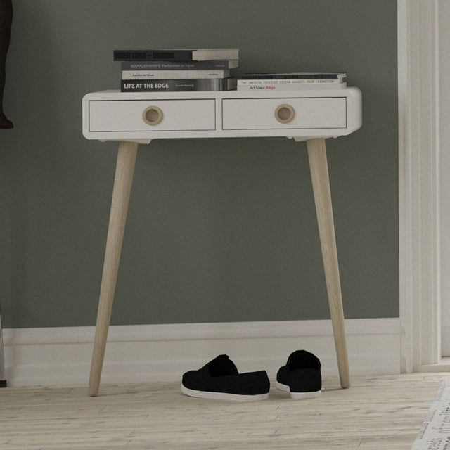 The Soft line Wooden Console Table with 2 Drawers, available at CozyFurnitureDirect, is the perfect blend of mid-century charm and modern functionality. Finished in a soft Off - white tone with pine-stained handles and elegant tapered legs, it brings warmth and sophistication to hallways, living - rooms, or compact spaces. Its two drawers provide practical storage for keys, letters, and everyday essentials, making it as functional as it is stylish. Expertly made in Denmark, this versatile piece can be used as a hallway table, accent table, or paired with other Soft line items for a coordinated look.