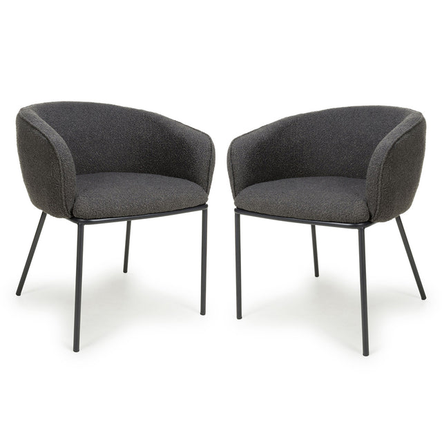 Elevate your dining area with the Lola Boucle Fabric Dining Chairs from CozyFurnitureDirect. Sold in a set of two, these fashionable chairs feature a modern curvy silhouette upholstered in soft grey boucle fabric, adding both style and texture to your dining space. The generously proportioned bucket seat with attractively curved high armrests ensures exceptional comfort, while the rounded black metal frame and splayed legs provide durability and stability. Perfect for UK homes, the Lola chairs blend contemporary elegance with everyday practicality, making them a versatile addition to dining rooms or open-plan interiors.
