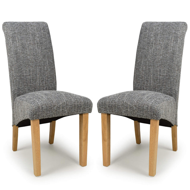 Add timeless style and everyday comfort to your dining space with the Karta Fabric Dining Chairs from CozyFurnitureDirect. Sold in a set of two, these classic roll back chairs are upholstered in a fashionable grey tweed-effect fabric, offering both elegance and durability. The sprung and belted seat provides excellent long-term comfort, while the natural rubber wood legs add sturdy support and a warm finish to the design. Perfect for both traditional and modern interiors, the Karta chairs are a versatile choice for UK homes seeking practical sophistication in their dining setup.