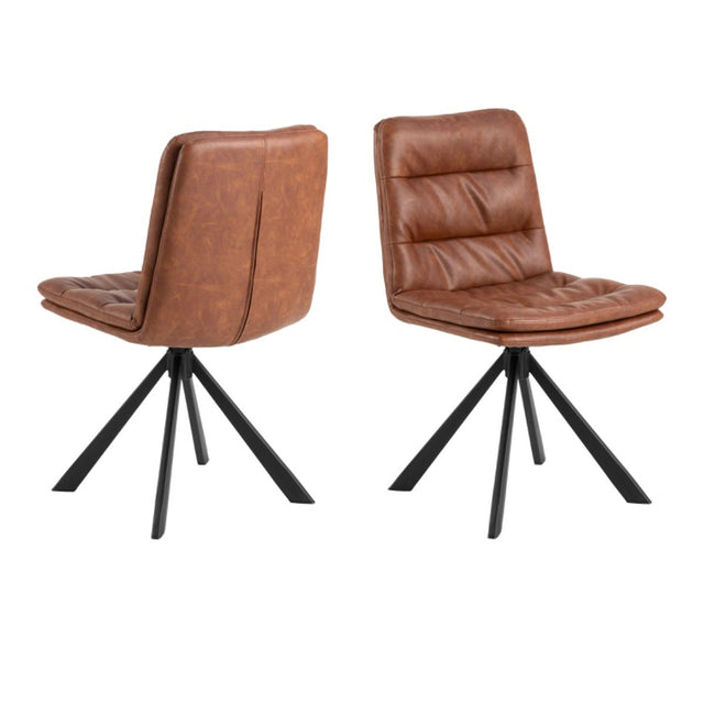 Bring a touch of mid-century charm and modern practicality to your dining space with the Faux Leather Dining Chairs in Set of 2 with Swivel Function - Dean, available at CozyFurnitureDirect. Upholstered in rich brandy faux leather, these chairs exude vintage-inspired elegance, enhanced by horizontal stitching that adds texture and character. Combining a warm, retro feel with sleek design, the Dean chairs are perfectly suited for UK dining rooms or home offices seeking stylish versatility. Fitted with a 360'° swivel function and supported by a sturdy matte black powder-coated 4-star base, they ensure both comfort and practicality. Sold as a set of two, these chairs are a timeless addition to any home, delivering sophistication, comfort, and durability with a mindful design approach.