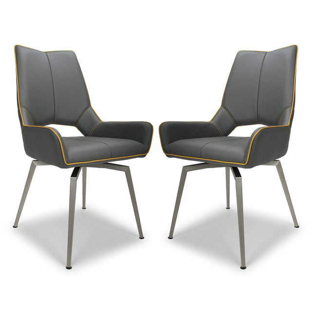 The Mako Faux Leather Dining Chairs bring cutting-edge design and modern convenience to your dining space. Available in a set of two at CozyFurnitureDirect, these chairs are upholstered in bold yellow leather-effect material with contrasting grey piping, creating a striking and contemporary look. Featuring a smooth swivel function that gently returns to a central position, they provide flexibility and comfort for everyday dining. Supported by stainless steel tripod-style legs, the Mako chairs combine durability with sleek aesthetics, making them an ideal choice for UK homes wanting a stylish upgrade.