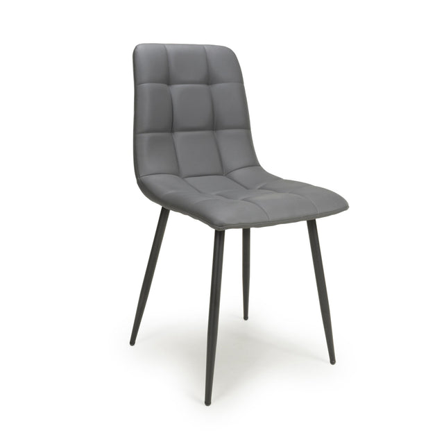 Bring contemporary sophistication to your dining space with the Madison Faux Leather Dining Chairs, available in a practical set of four from CozyFurnitureDirect. Upholstered in chic grey leather-effect material, these chairs exude modern elegance while offering everyday durability. The contoured seat and gently sloped backrest, enhanced with square panelled stitching, ensure both style and comfort. Supported by tapered black metal legs with a sturdy cross-frame design, the Madison chairs are perfect for creating a sleek, refined dining setting in any UK home.