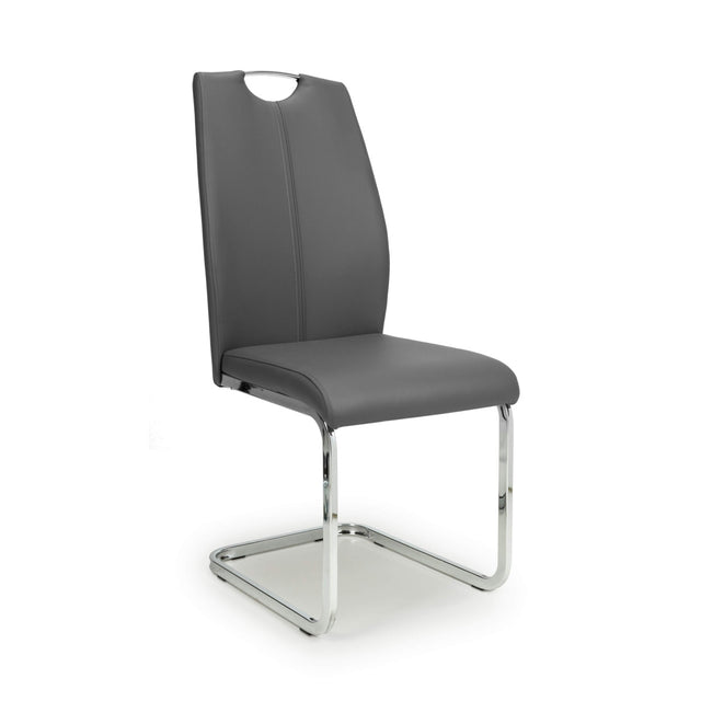 The Toledo Faux Leather Dining Chairs deliver contemporary style and everyday comfort, making them a sleek addition to any dining space. Available in a set of four at CozyFurnitureDirect, these chairs are upholstered in graphite grey leather-effect fabric for a sophisticated, modern look that is both durable and easy to maintain. The ergonomic curved backrest with vertical stripe stitching adds refinement, while the chrome cantilever legs provide a stylish contrast and strong support. Designed with a practical chrome handle for ease of movement, the Toledo chairs offer a perfect balance of form and function for UK homes.