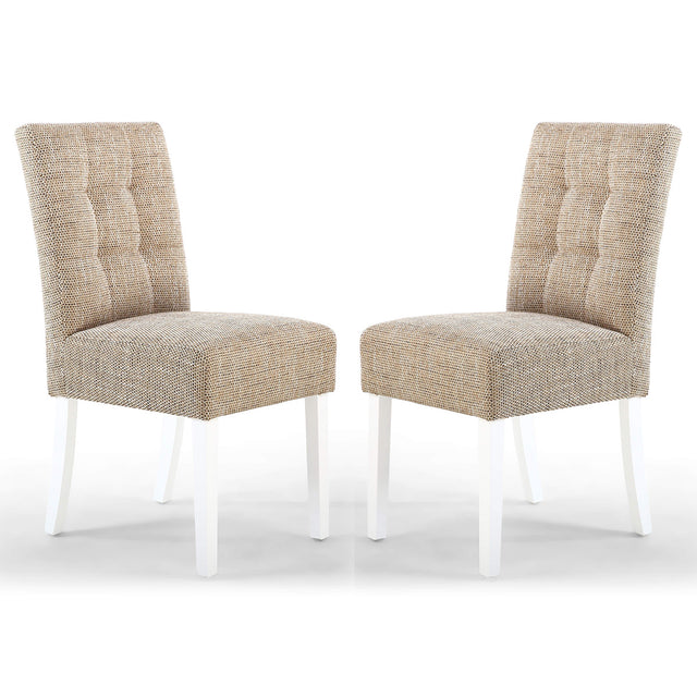 Bring contemporary elegance to your dining space with the Moseley Waffle Tweed Fabric Dining Chairs, available in a convenient set of two from CozyFurnitureDirect. Upholstered in stylish oatmeal tweed-effect fabric, these chairs feature stitched waffle detailing on the backrest for a chic textured finish. The deep-seated design combined with a sprung and belted seat ensures enhanced comfort and support. Completed with white rubber wood legs, the Moseley chairs offer a modern and refreshing contrast, making them an excellent choice for UK homes seeking both style and practicality.