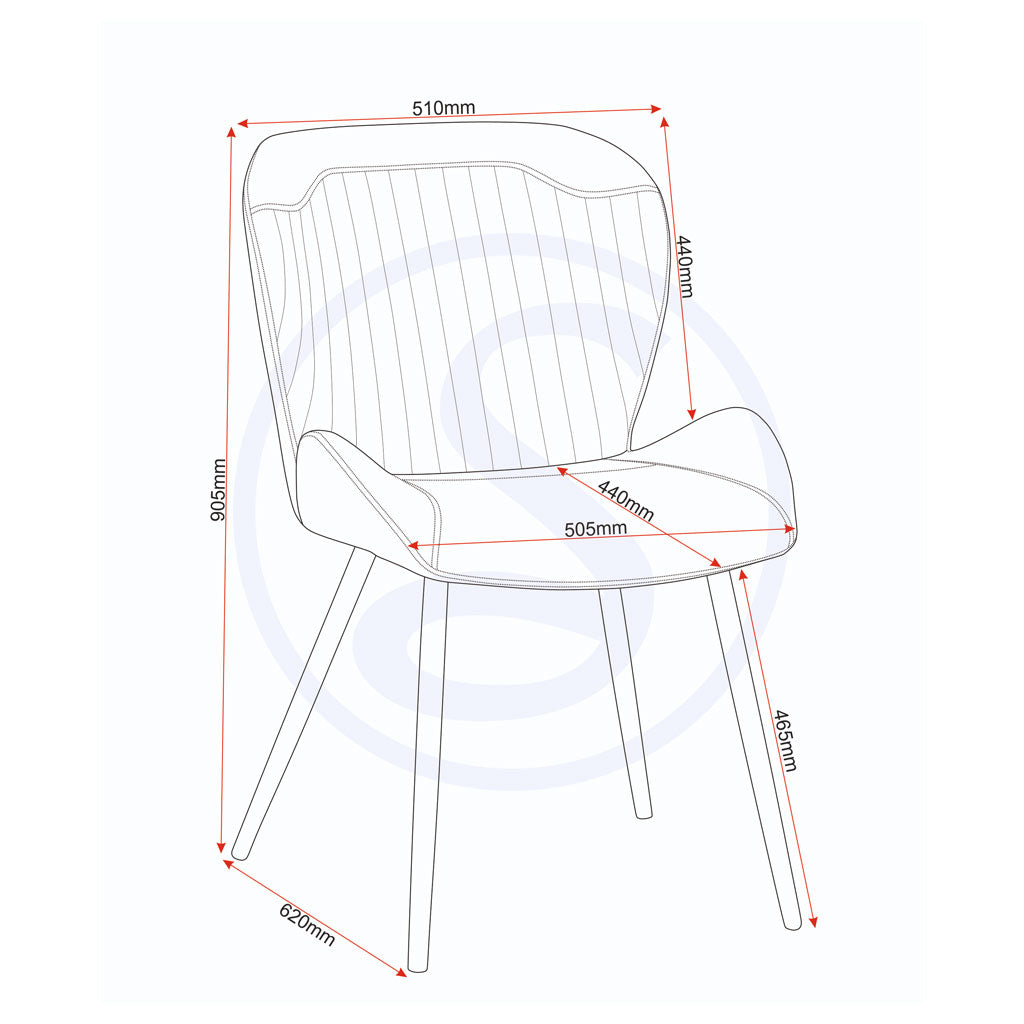 - Chair: Seat Pad Size W505 x D440 mm, Seat Pad Height 465 mm, Backrest Height 440 mm, Leg Thickness 25 mm