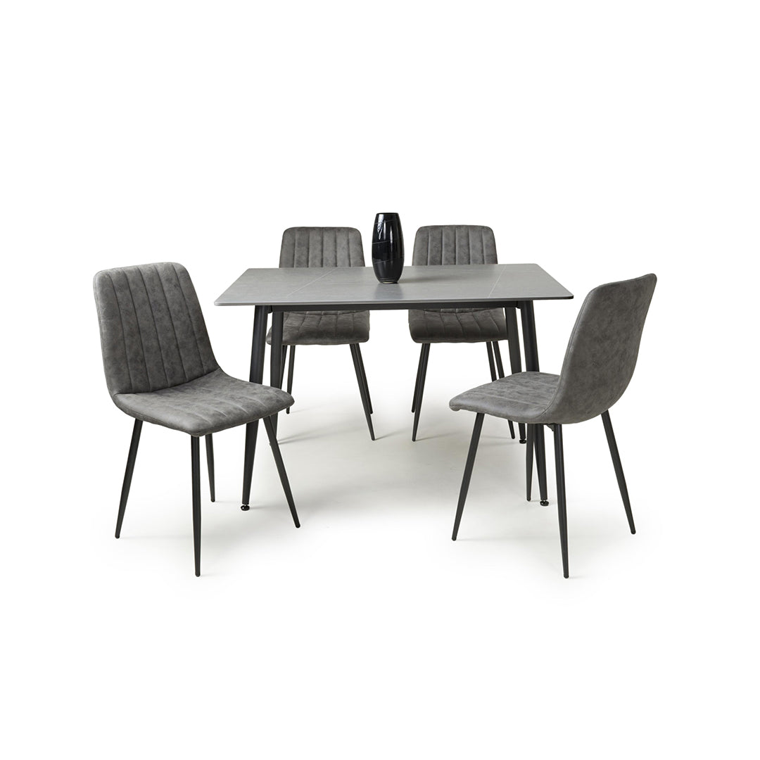 Create a sleek, contemporary focal point in your UK dining room with the Ceramic Dining Table 120cm in Grey With 4 Lisbon Fabric Chairs - Monaco from Cozy Furniture Direct. This classic 1.2m rectangular ceramic table in grey granite finish features a sturdy 10mm thick top with fashionable diagonal criss-cross chalk markings and four metal legs with adjustable feet. Perfectly matched with four Lisbon grey microfiber chairs boasting gently sloped contoured seats, stylish vertical striped stitching, and cross-frame tapered black metal legs for modern comfort.