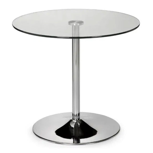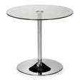 - Contemporary pedestal dining table with clear tempered glass top and chrome base