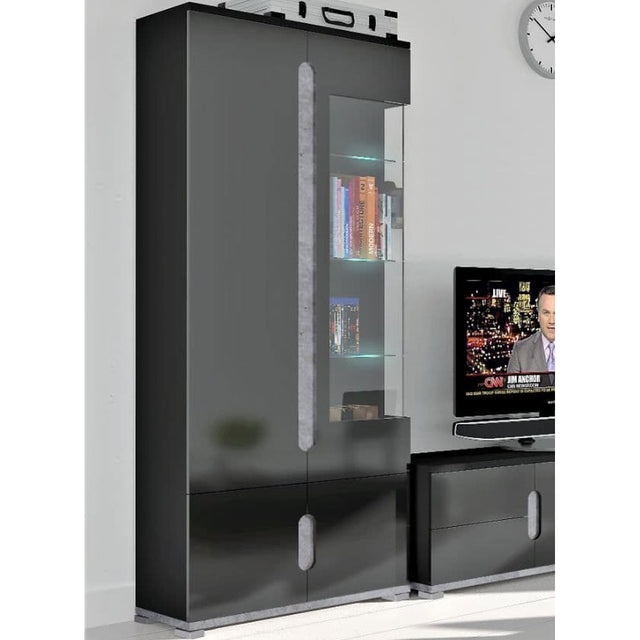 Illuminate your living space with the High Gloss Display Cabinet Tall With 4 Doors - Elmira, available at CozyFurnitureDirect. The Elmira cabinet features a striking high gloss finish paired with concrete grey accents, combining contemporary style with practical elegance. Designed with four doors, including one glass door revealing three glass shelves, it offers an ideal space to showcase your treasured items. Integrated LED lights enhance the display, creating a captivating focal point in any room. Measuring 191cm high, 93cm wide, and 42cm deep, this cabinet is a perfect blend of stylish storage and modern sophistication for British homes.