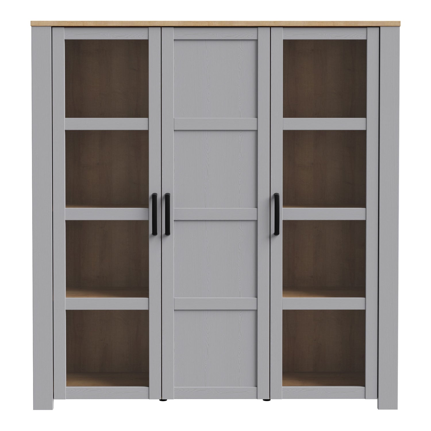 • three-door layout with two glazed doors for display and one solid for hidden storage