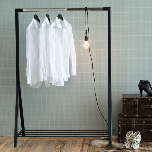 Streamline your wardrobe display with the Metal Clothes Rack - Brent, available at CozyFurnitureDirect. This contemporary piece unites a matte black powder-coated steel frame with gleaming chrome accents, offering a top hanging bar, lower shelf for shoes, and a sturdy base for tidy organisation. Space-saving and robust, it adds stylish functionality to bedrooms, dressing areas, or open-plan UK homes.