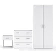 - Three-piece set includes bedside cabinet, chest of drawers, and wardrobe for comprehensive storage