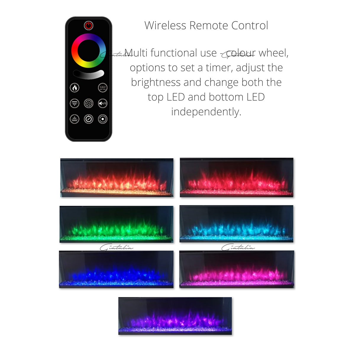 - Realistic 3D flame effect adjustable through seven vibrant LED colour options