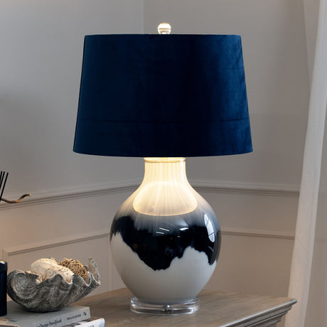 Navy Blue Velvet Shade Table Lamp With Blue and White Shadows Glass Base - Ice