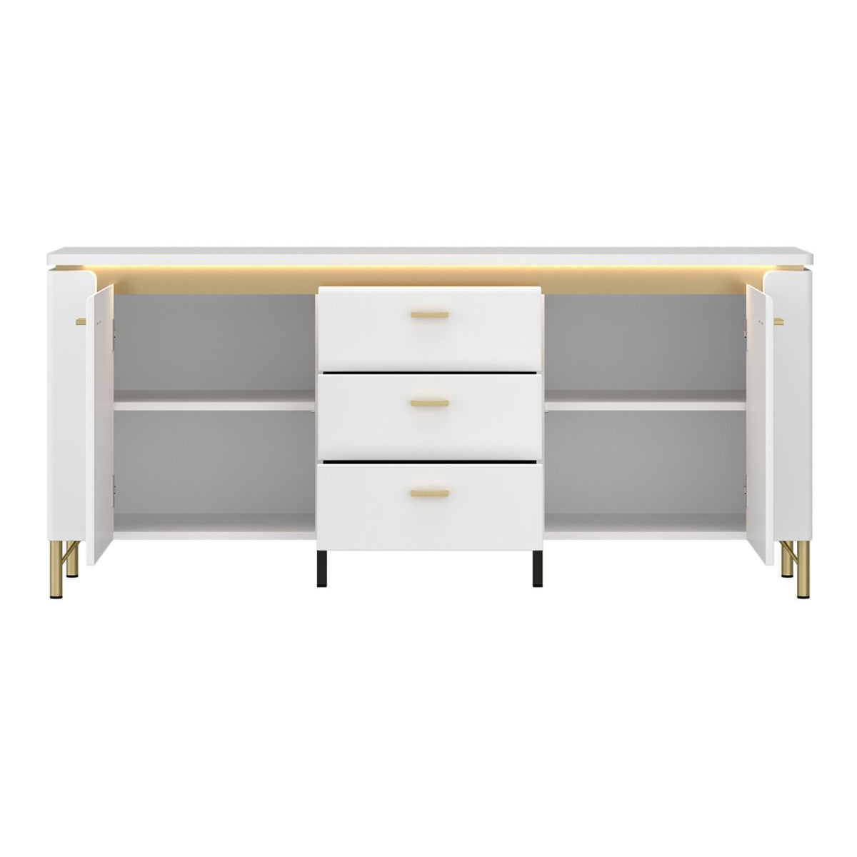 Enhance your living - room with the Lazio High Gloss TV Stand with 2 Doors, 3 Drawers and LED Lights, available at CozyFurnitureDirect. Finished in a luxurious combination of Alpine White and Gloss White with subtle gold accents, this modern TV cabinet blends stylish design with smart storage solutions. Featuring soft-close doors, push-to-open drawers and integrated LED lighting, it offers both convenience and sophistication. With ample space to store media devices, DVDs and accessories, the Lazio TV Stand ensures your entertainment area remains sleek, organised and contemporary. Designed with high metal legs and premium materials, it's a durable and elegant addition to UK homes.