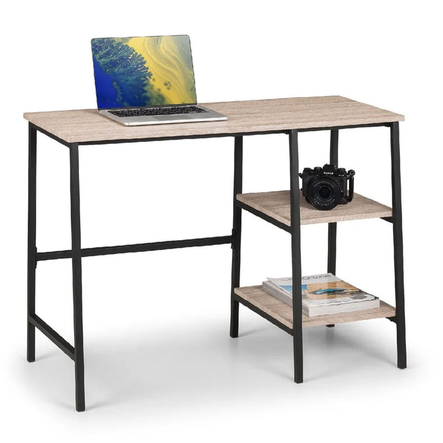 Add a touch of industrial elegance to your workspace with the Tribeca Wooden Desk for Home and Office from CozyFurnitureDirect. Designed with modern simplicity and everyday practicality in mind, this desk combines a sturdy black coated metal frame with a warm wooden finish for a stylish contrast. Perfect for home offices or study areas, the Tribeca Desk features two open shelves on the right-hand side, offering convenient storage for stationery, books or office supplies. Its clean lines and minimalist design make it an excellent fit for contemporary UK interiors, blending functionality and style effortlessly.