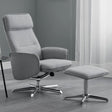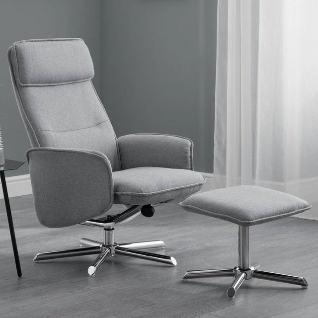 Experience ultimate relaxation with the Aria Linen Fabric Recliner Chair and Footstool, available at CozyFurnitureDirect. Upholstered in soft grey linen fabric and supported by a sleek chrome base, this modern recliner blends comfort, versatility, and style, making it perfect for any UK living - room, home office, or reading nook. Designed with your comfort in mind, the Aria Recliner features plush padding, a supportive headrest, and a matching footstool to elevate your leisure time. Its smooth reclining and 360° swivel functions allow you to effortlessly find the perfect position for work, rest, or relaxation. With its compact, space-saving design, the Aria chair is both functional and elegant, offering a timeless addition to contemporary homes.