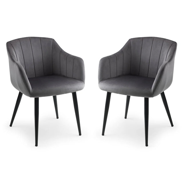Add sophistication and modern elegance to your dining room with the Velvet Dining Chairs in Set of 2 Scalloped - Hobart, available at CozyFurnitureDirect. These beautiful chairs feature plush grey velvet upholstery paired with a striking scalloped backrest, creating a luxurious look and feel. Supported by sturdy matte black legs, they combine durability with contemporary flair, making them perfect for both dining and lounging spaces. The ergonomic design ensures personalised comfort, providing excellent support for long dinners or relaxed conversations. Whether used as dining chairs or statement accent pieces, the Hobart chairs bring timeless style and comfort to any UK home.