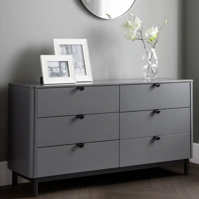 Maximise your storage space without compromising on style with the Chloe Wooden Wide Chest of 6 Drawers, available at CozyFurnitureDirect. Designed with a modern retro flair, this piece is finished in a sleek storm grey lacquer and complemented by satin black wooden legs and handles for a bold yet sophisticated look. The rounded corners add a touch of softness, perfectly balancing contemporary design with functionality. Featuring six spacious drawers, this wide chest is ideal for neatly organising clothing, accessories, and household essentials, making it a stylish and practical choice for UK bedrooms.